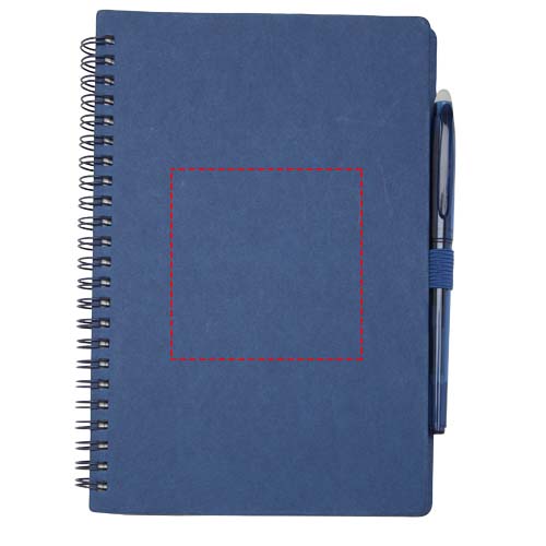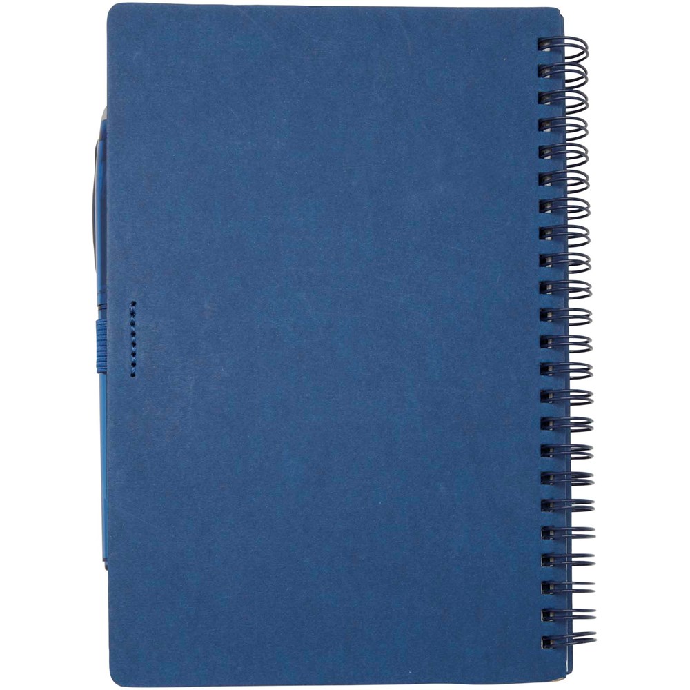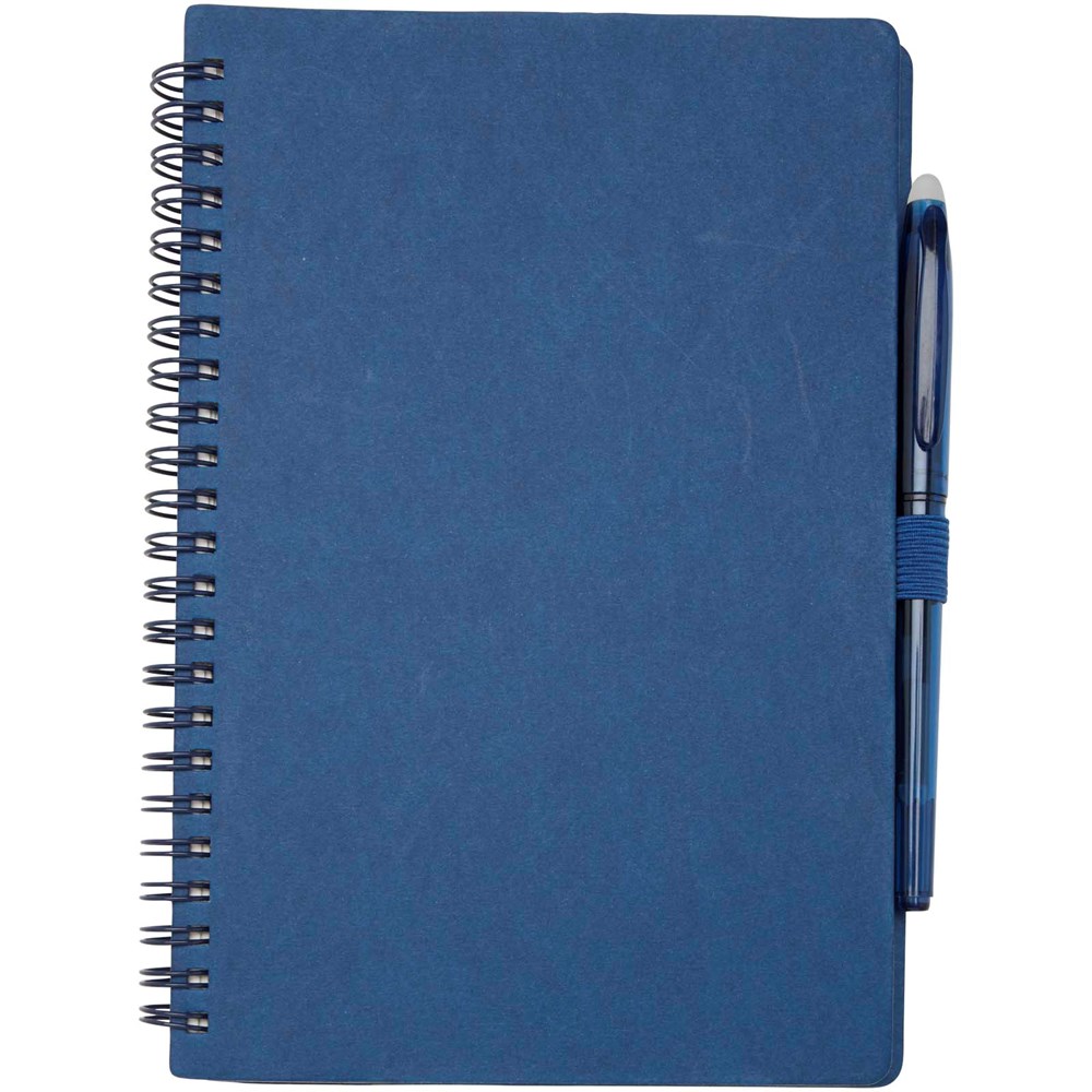 Wiederverwendbares A5 Hardcover Notizbuch und Stiftset aus Steinpapier. Das Notizbuch hat einen Einband aus Karton, abgerundete Ecken und besteht aus 32 linierten Seiten aus 120 g/m² Papier. Steinpapier ist 100 % holzfrei und der Produktionsprozess verbraucht weniger Energie als recyceltes oder neues Zellstoffpapier. Auf der Rückseite befindet sich eine Tasche für ein schwarzes Reinigungstuch (im Lieferumfang enthalten). Der radierbare Stift besteht aus recyceltem Kunststoff mit transparentem Schaft, weißem Radiergummi auf der Oberseite und einfarbigem Griff. Tintenfarbe: Schwarz. Schreiblänge: 250 Meter. Schreibspitze: 0,7 mm.