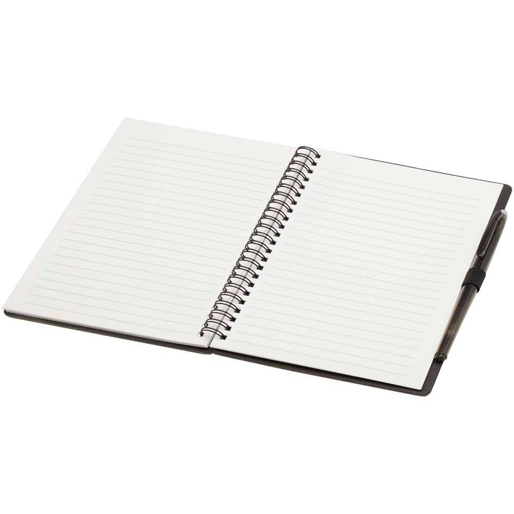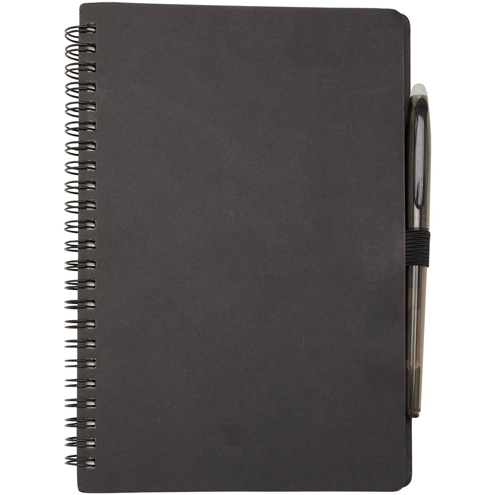 Wiederverwendbares A5 Hardcover Notizbuch und Stiftset aus Steinpapier. Das Notizbuch hat einen Einband aus Karton, abgerundete Ecken und besteht aus 32 linierten Seiten aus 120 g/m² Papier. Steinpapier ist 100 % holzfrei und der Produktionsprozess verbraucht weniger Energie als recyceltes oder neues Zellstoffpapier. Auf der Rückseite befindet sich eine Tasche für ein schwarzes Reinigungstuch (im Lieferumfang enthalten). Der radierbare Stift besteht aus recyceltem Kunststoff mit transparentem Schaft, weißem Radiergummi auf der Oberseite und einfarbigem Griff. Tintenfarbe: Schwarz. Schreiblänge: 250 Meter. Schreibspitze: 0,7 mm.