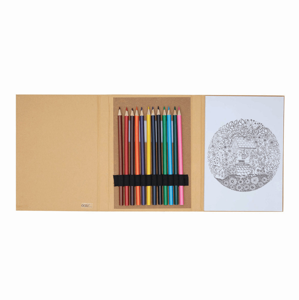 Malset COLOURFUL BOOK: bestehend aus 10 Malblättern mit verschiedenen Motiven zum Ausmalen, 40 leeren Blättern, 12 lackierten Buntstiften (angespitzt), im Karton mit Sichtfenster