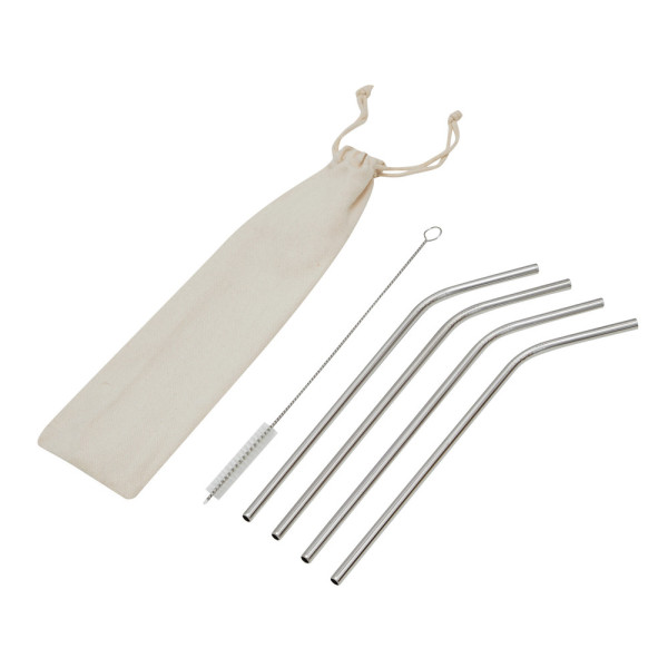 Edelstahl-Strohhalm-Set DRINK HAPPY: bestehend aus 4 Trinkhalmen mit Knick und Bürste für eine bequeme Reinigung, im umweltfreundlichen Baumwollbeutel