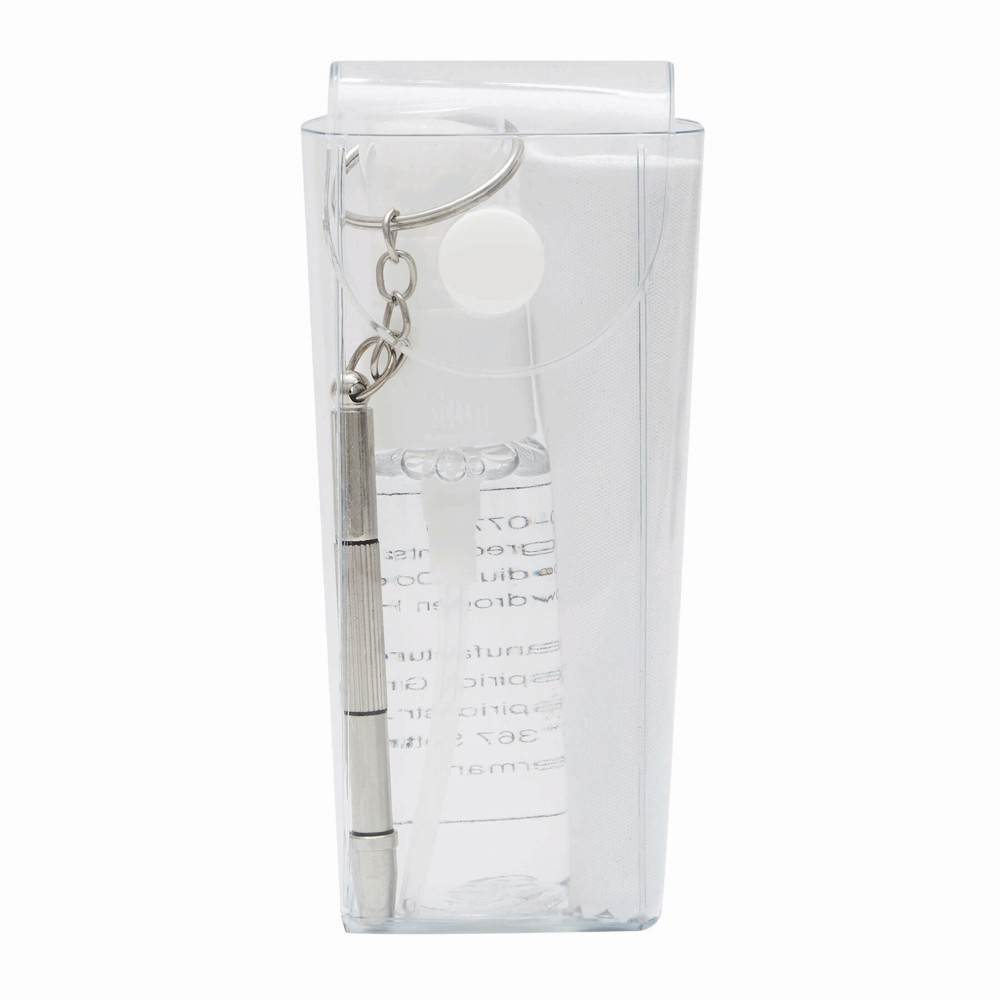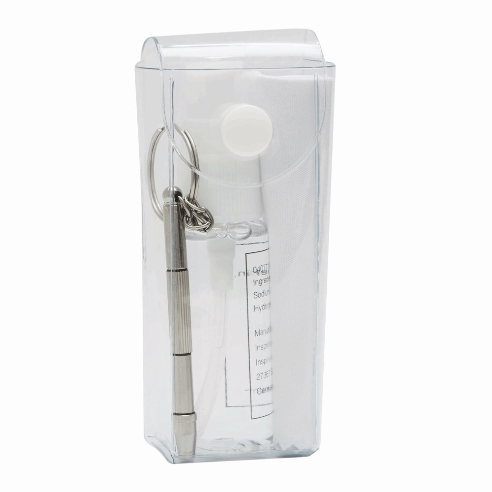 Brillen-Reinigungsset VIEW: Sprühfläschchen mit Reinigungsflüssigkeit (ca. 20 ml), Brillenputztuch, Mini-Schraubendreher mit Schlüsselring, in PVC-Hülle mit Druckknopfverschluss