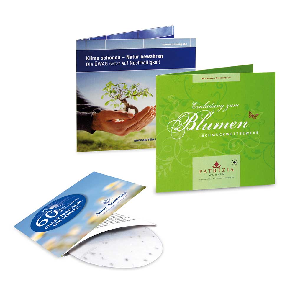 Attraktiver Mailingverstärker mit integriertem Samenkissen (Sommerblumen, Margeriten – weitere Sorten auf Anfrage) für einfaches Einpflanzen. Ihre Werbebotschaft wird auf sechs Seiten à 10 x 10 cm ansprechend präsentiert – viel Raum für Kommunikation und Informationen.