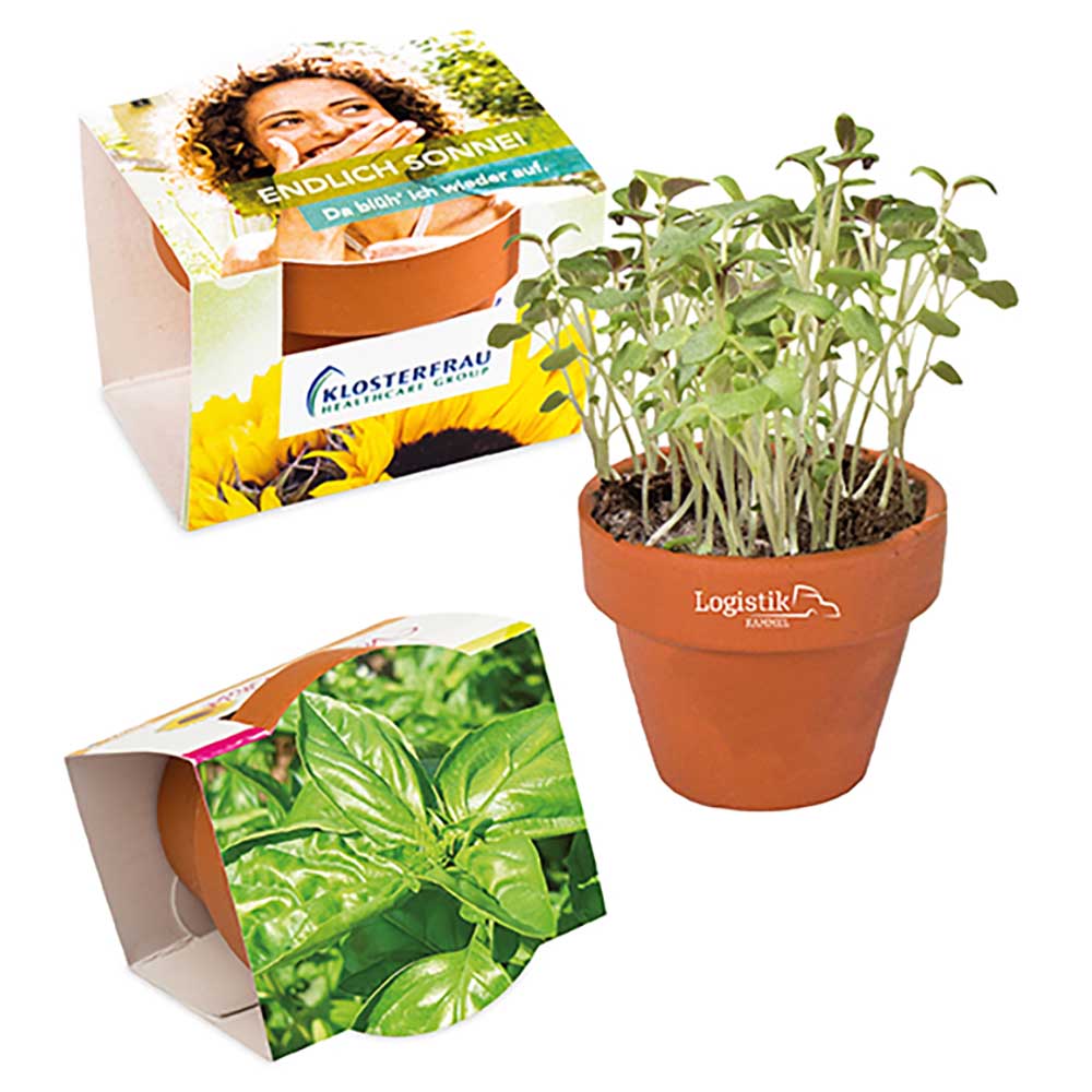 Für abwechslungsreiches Grün im Büro sorgt das Logo-Töpfchen aus Terracotta, das mit unterschiedlichen Samen, sowie einer Substrattablette als Erde geliefert wird. Mit diesem interaktiven Werbebotschafter wird der Kunde zum Gärtner und Ihr Unternehmen sorgt für ein wenig mehr Grün auf dieser Welt. Gleich doppelte Werbemöglichkeiten bietet dieses Töpfchen durch einen Logodruck auf dem Blumentopf und den im Digitaldruck 4-farbig, individuell gestaltbaren Verpackungsvarianten aus Karton.