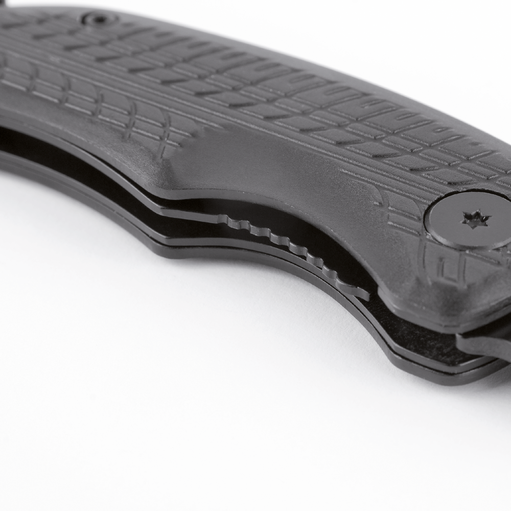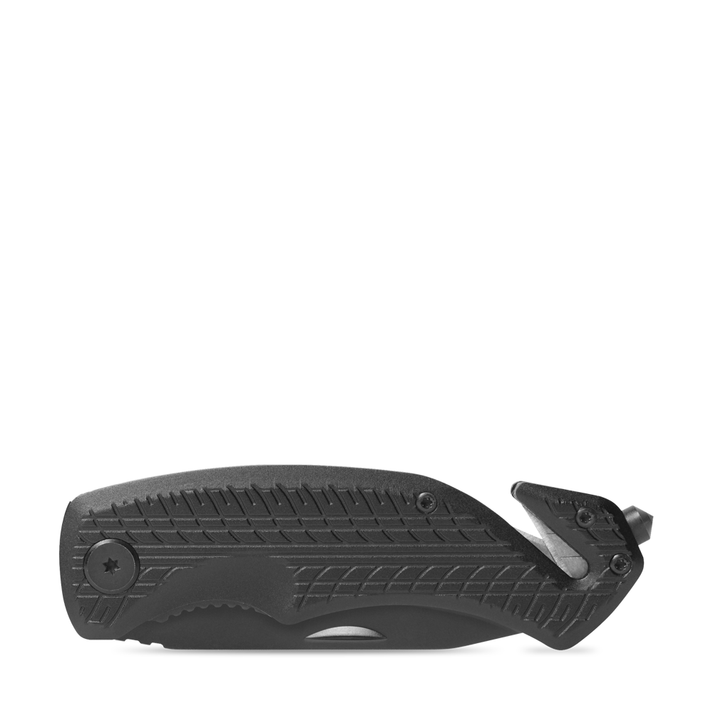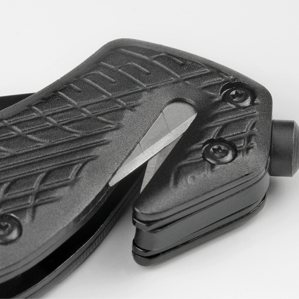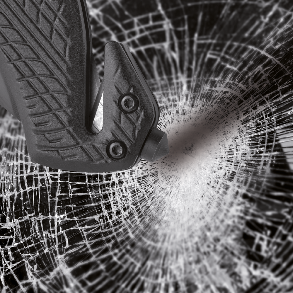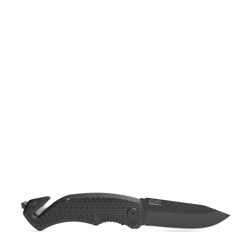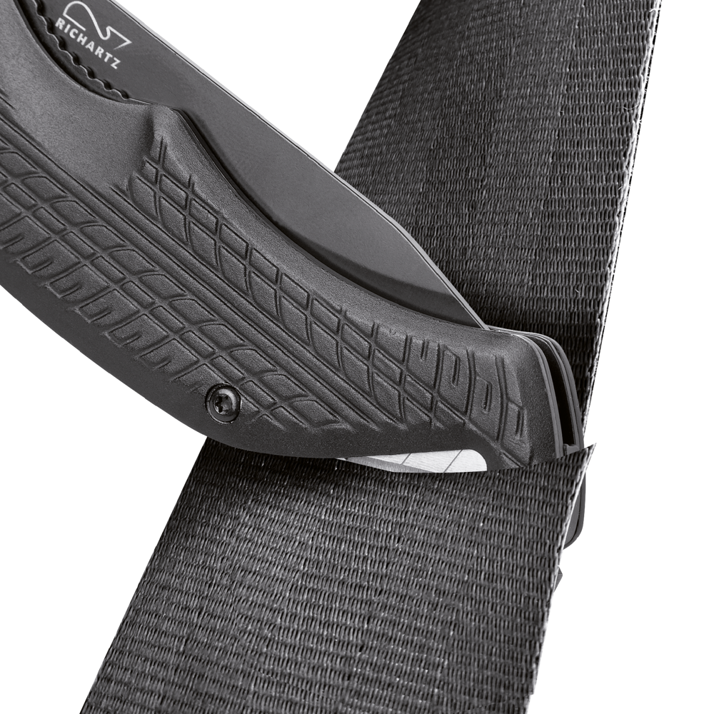 Das schwarz beschichtete RICHARTZ Rescue-Tool mit kräftiger, rostfreier Klinge und Safety-Lock Klingenverriegelung gibt Sicherheit im täglichen Gebrauch. Der Gurtschneider mit doppelter Klingenführung garantiert den schnellen Schnitt. Der speziell gehärtete Werkzeugstahl des Glasbrechers ermöglicht das präzise Zerschlagen der Glasscheibe. Die geprägte Reifenstruktur auf dem Griff, in Kombination mit der schwarz beschichteten Klinge, steht für Aktualität und Sportlichkeit.