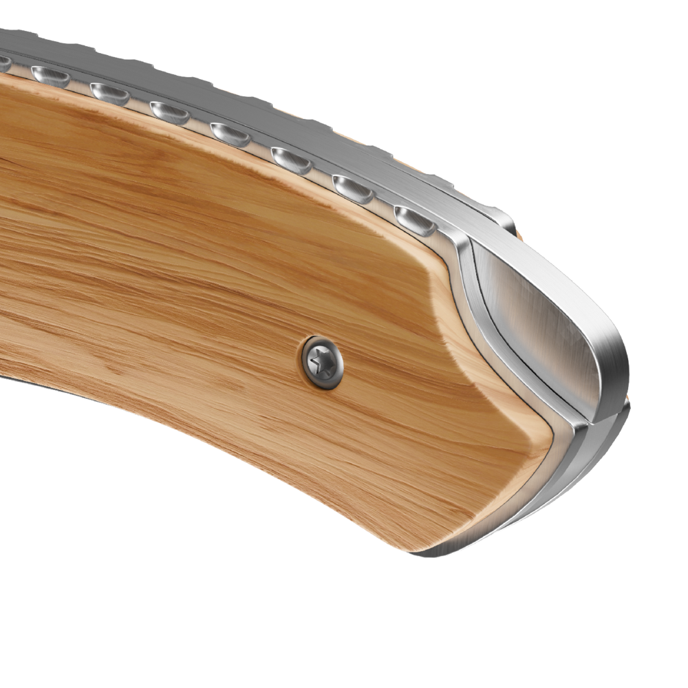 Unser Knife-to-have! Weil wir finden, dass Arbeitserleichterung auch zeitgemäß und schön sein darf. Überzeugt Fans stabiler Klingen ebenso wie Ästheten und Trendbewusste. Edelstahlgriffe mit hochwertigem Olivenholz erzeugen das Gefühl, etwas Besonderes zu besitzen, und lassen eine ästhetische Holzgravur zu. Die hohe Qualität und Safety-Lock-Verriegelung machen jeden Handgriff mit dem Messer sicher und präzise.