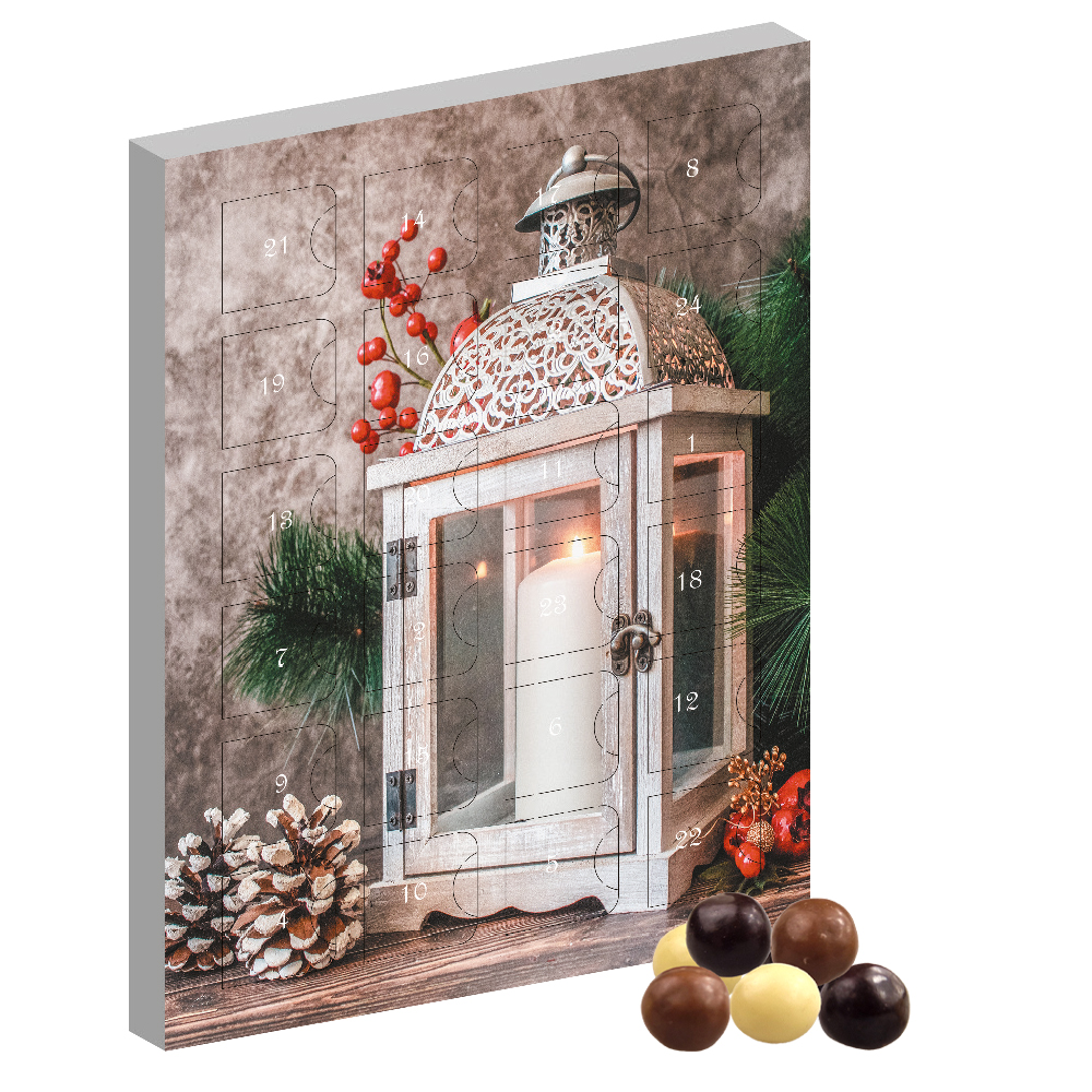 Adventskalender Mini Hochformat Faltschachtel. Werbeanbringung als Direktdruck in 4c individuell bedruckbar.