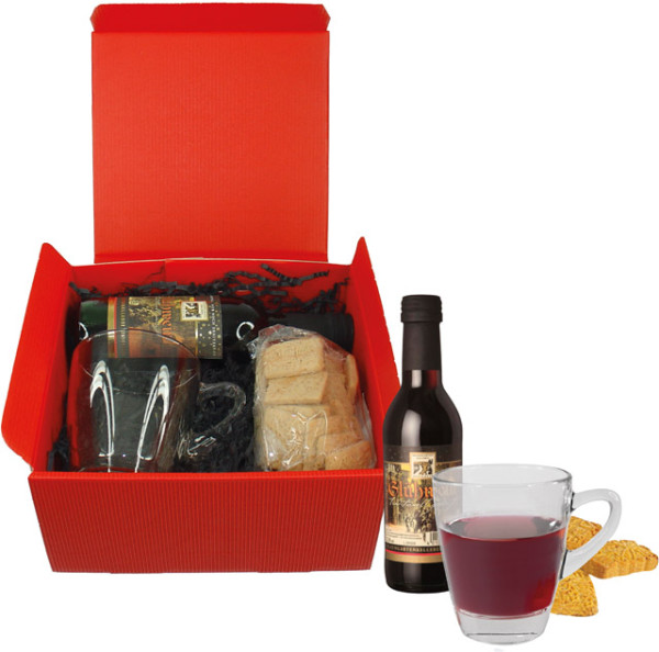Nichts geht in der Advents- und Weihnachtszeit über ein gutes Glas heißen Glühwein. Dieser lässt sich mit unserem Set ganz einfach zuhause zubereiten. Einfach den Glühwein erhitzen und im beigelegten Teeglas zusammen mit den Butterspekulatius genießen. Das Set enthält: Glühwein 0,25 l, Teeglas und 100 g Butterspekulatius. Platz für den Werbedruck auf dem Anhängekärtchen Artikel 6202(40 x 60 mm) ab 100 Stück oder Ihre Beilage nach Wunsch