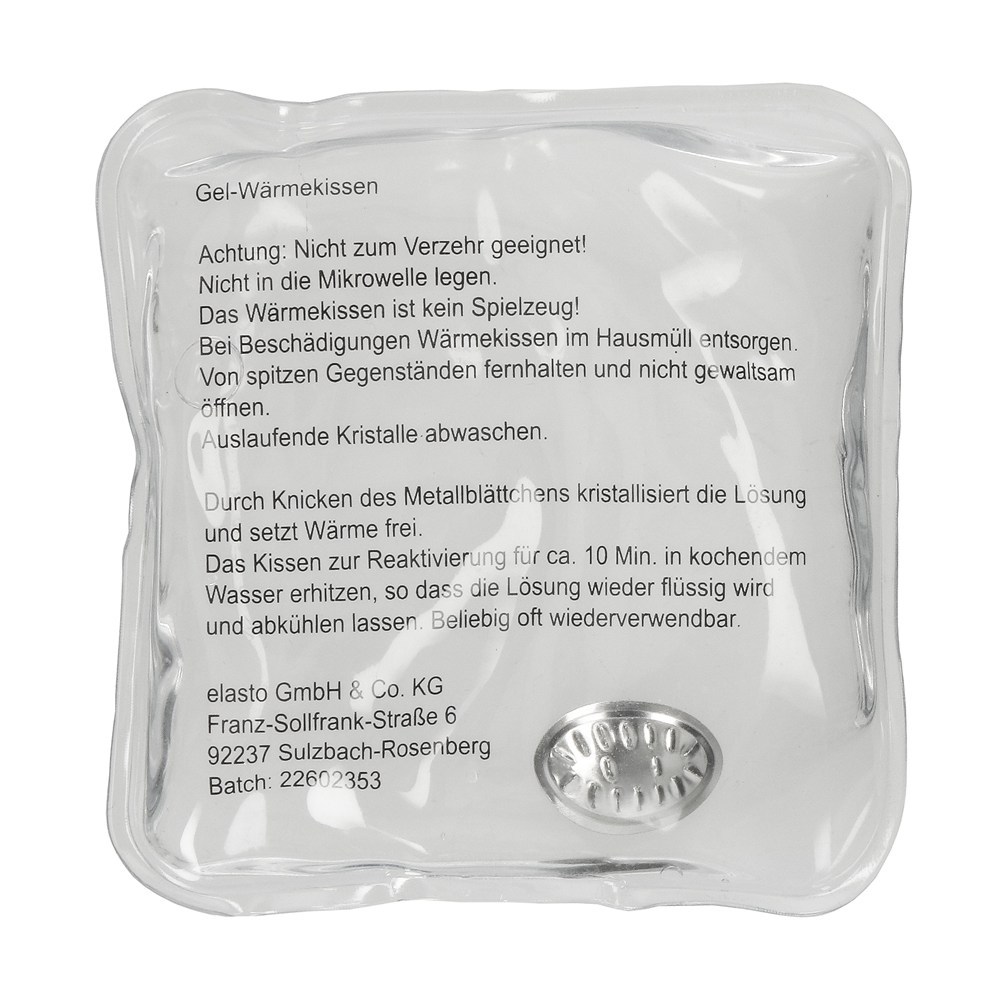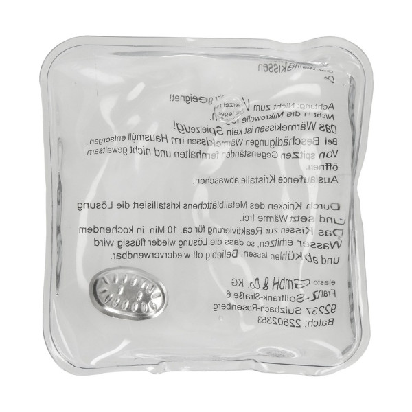 Gibt ca. 15 Minuten optimale Wärme bis 50°C bei Kristallisation der Flüssigkeit durch Knicken des Metallplättchens. Nach Gebrauch das Wärmekissen 10 Minuten in 100°C kochendes Wasser legen. Wiederverwendbar.