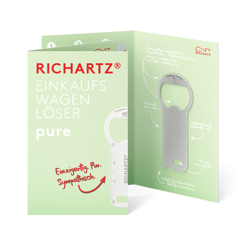 Der RICHARTZ® EINKAUFSWAGENLÖSER pure ist der praktische Werbeträger für Marken und Unternehmen. Mit einer individuellen Lasergravur und individuell gestalteter 4-seitigen Verpackung in 4c, werben Marken aufmerksamkeitsstark und aussagekräftig!