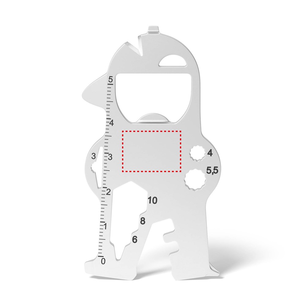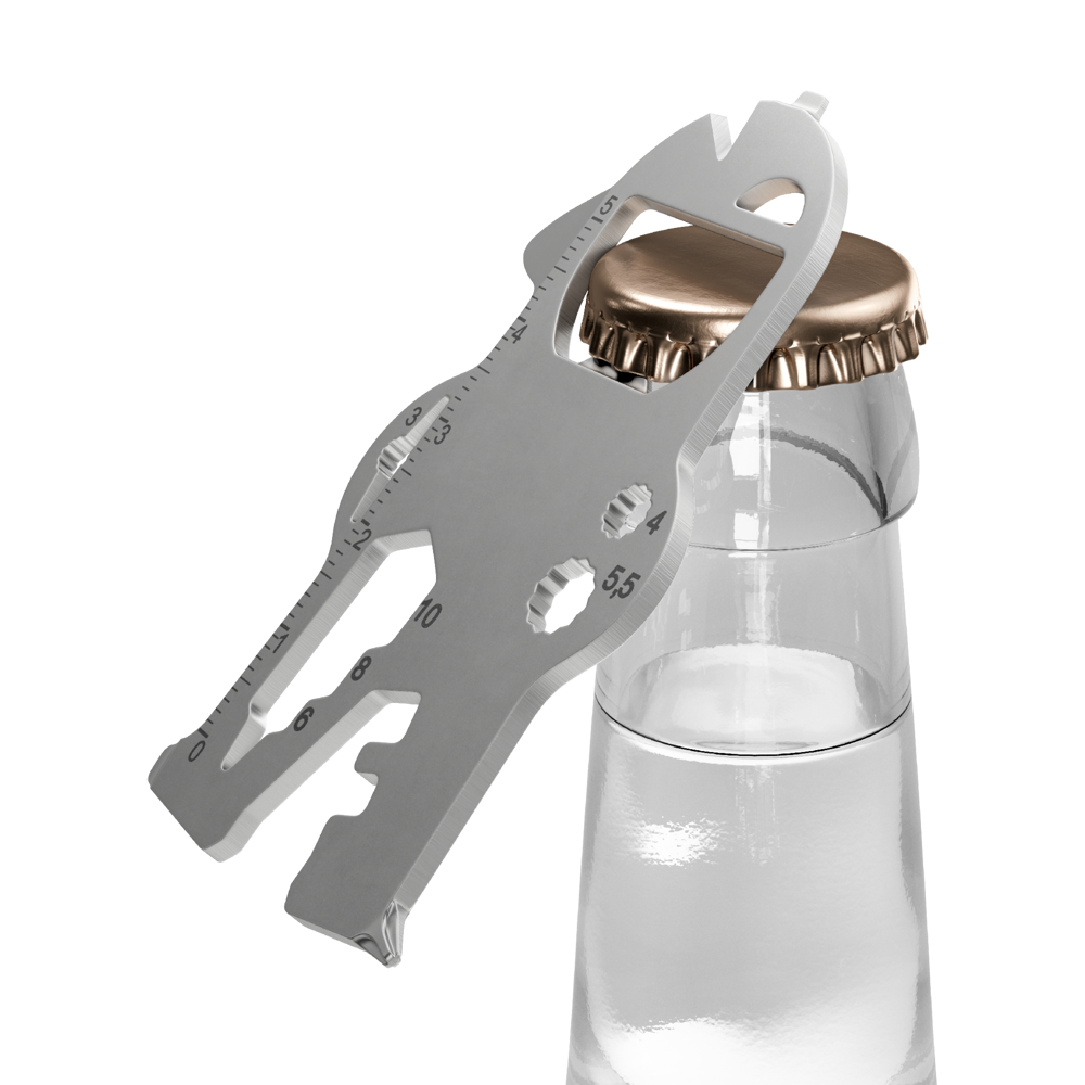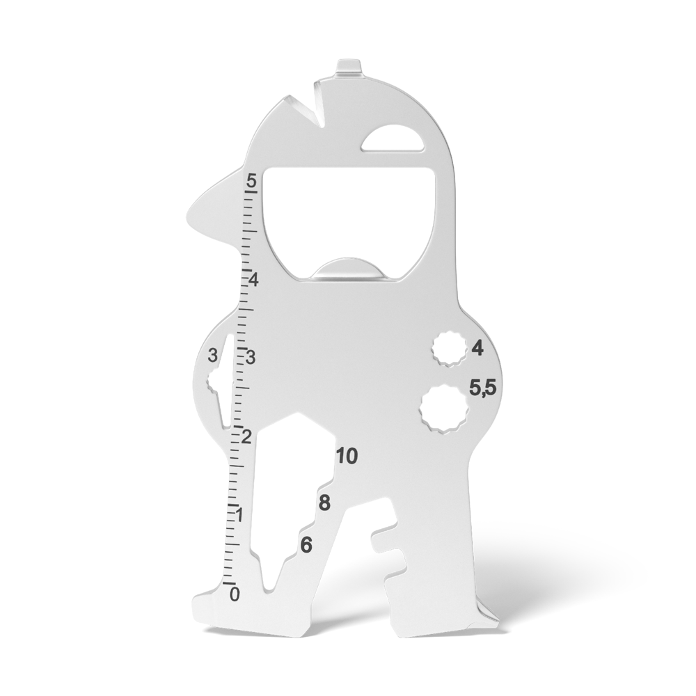 Die nützlichen Funktionen sind ein Mehrwert im Alltag und durch die lange und häufige Nutzung ist ein dauerhafter Werbeerfolg garantiert. Durch seine figurale Formgebung samt Bauhelm bietet sich das Multitool für den Schlüsselbund insbesondere für das Baugewerbe an.