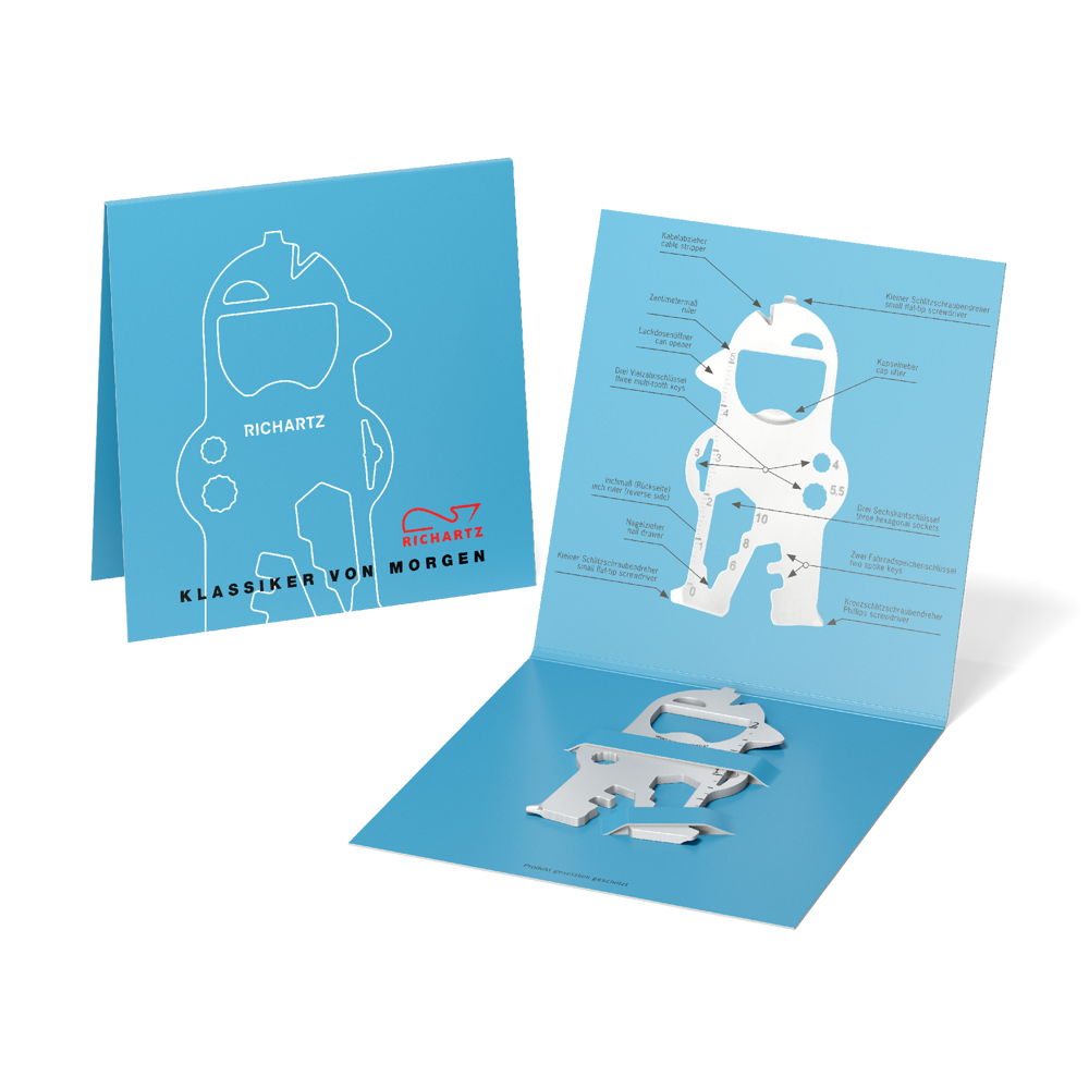 RICHARTZ KEY TOOL® bob ist der sympathische Werbeträger für Marken und Unternehmen. Mit einer individuellen Lasergravur und individuell gestalteter 4-seitigen Verpackung in 4c, werben Marken aufmerksamkeitsstark und aussagekräftig!