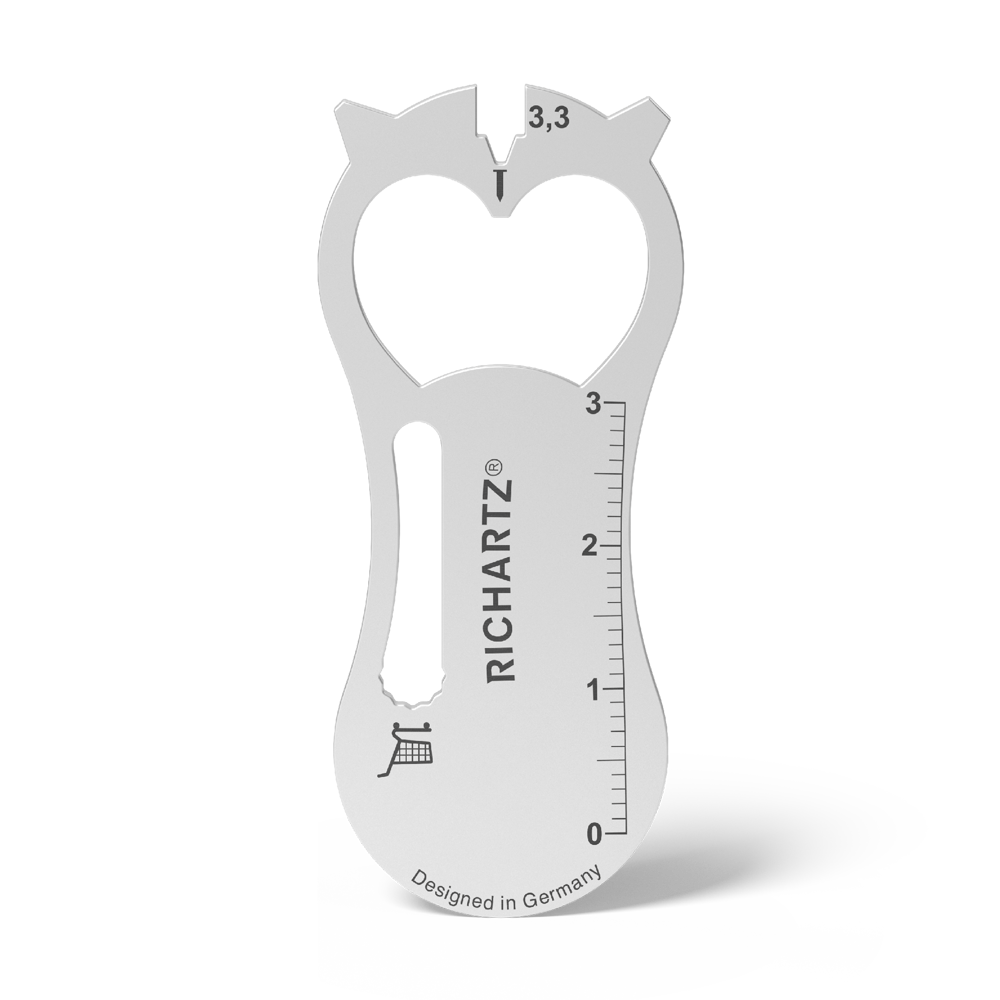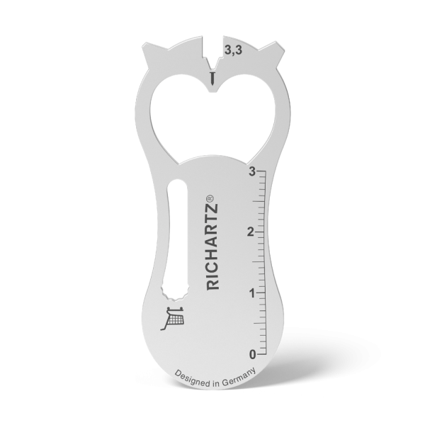 Unser Einkaufswagenlöser mit Herz: Formschöne Ausgabe mit in den Kapselheber integrierter Herzform. Dank Schlüsselring-Slot können alle Funktionen bestens genutzt werden. Damit beweist das gute Stück zudem noch eine Portion Cleverness. Dass das Ganze mit seinen zahlreichen Funktionen im Alltag unschlagbar vielseitige Dienste leistet und dazu etwas fürs Auge ist, muss RICHARTZ nicht extra erwähnen. Oder...?!