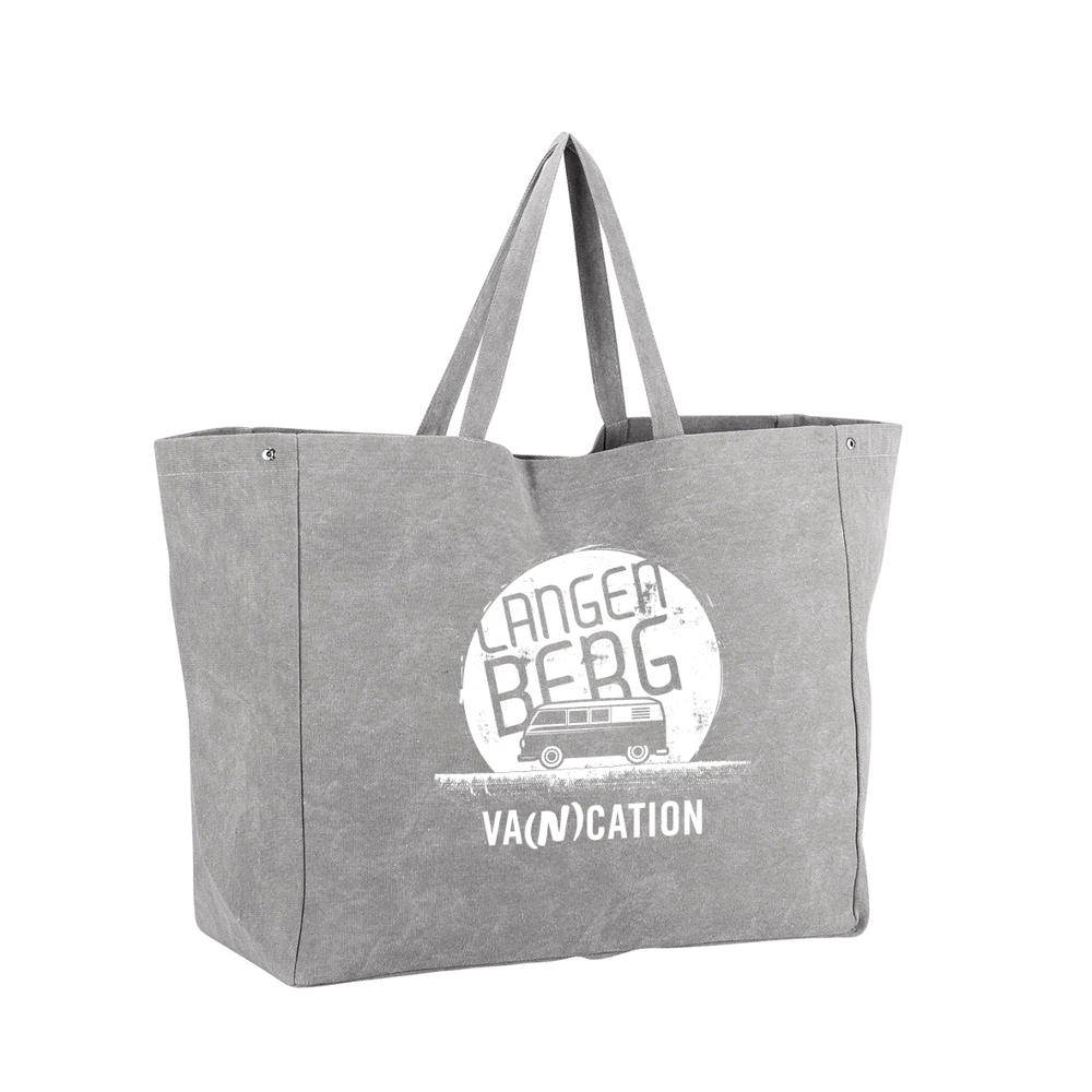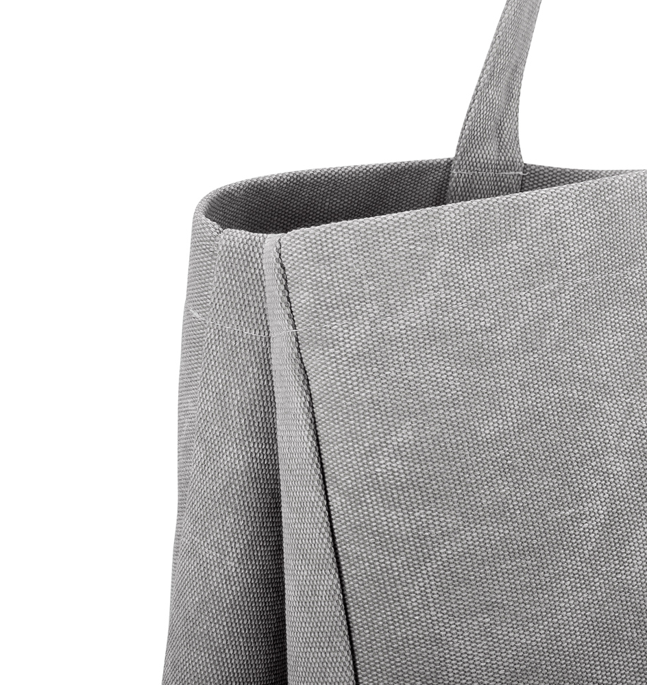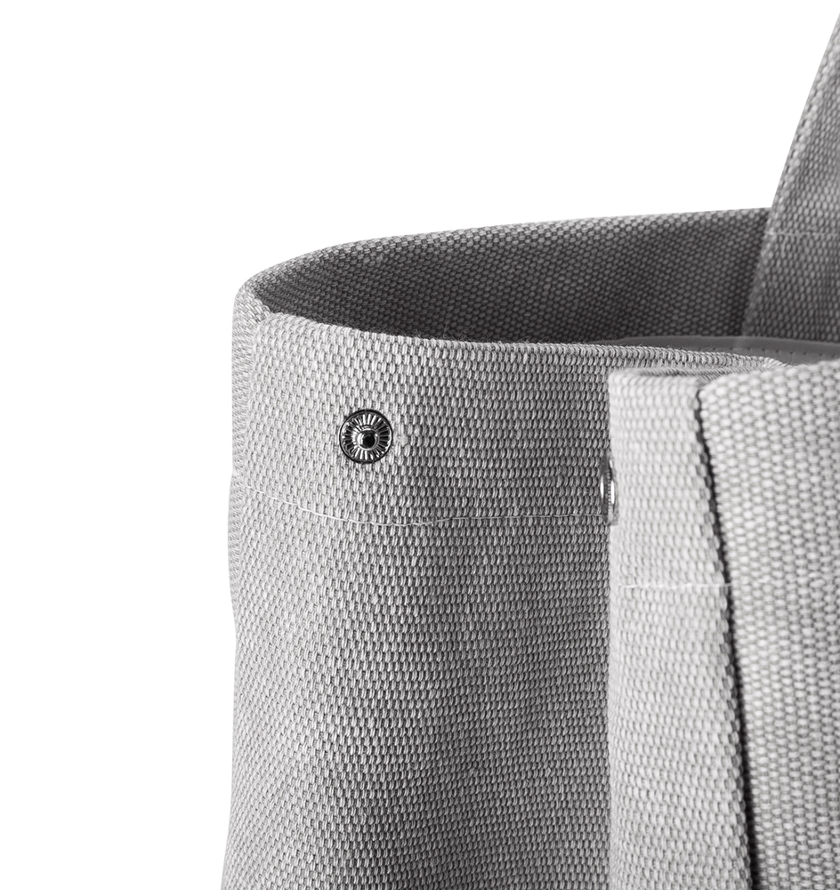 Die Tasche besteht aus Polyester-Canvas und verfügt über ein offenes Hauptfach, das mit einem Magnetknopf verschlossen wird. Sie ist mit einem Druckknopf verkleinerbar und hat eine kleine offene Innentasche. Mit einem Volumen von ca. 75 l bietet die Tasche viel Stauraum und Flexibilität.