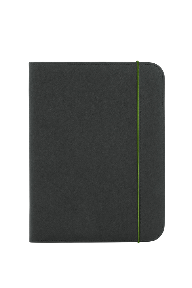 schwarze Schreibmappe mit Organizer-Elementen; verschließbar mit farbigem Gummiband; inkl. Schreibblock; flaches Einsteckfach; Gummischlaufe für Kugelschreiber