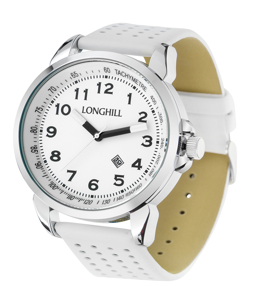Ausstattung: Gehäusetiefe: 11,4 mm, Uhrwerk: PC-32 mit Datum, Zifferblatt weiß, Zeiger schwarz/weiß, Gehäuseboden Edelstahl, 3 ATM waterresistant, Kunstlederarmband mit Lochdesign weiß, 24 mm