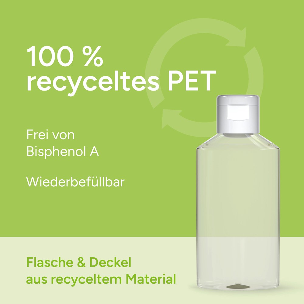 Flasche hergestellt aus 100% recyceltem PET, transparent mit leichter R-PET-Färbung. Klappdeckel "weiß" aus recyceltem PP, zufällig ausgerichtet. Nachfüllbar.